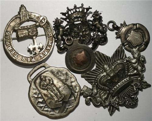 6 miscellaneous pieces: 2 silver unamed, unattributed medals (1 has plain red gold inlay centre); and 1 each Ingersoll-Rand Co. insignia badge; 2 Crowned Coat of Arm Badge/Pin and Wreath Design Memorial Pin inscribed