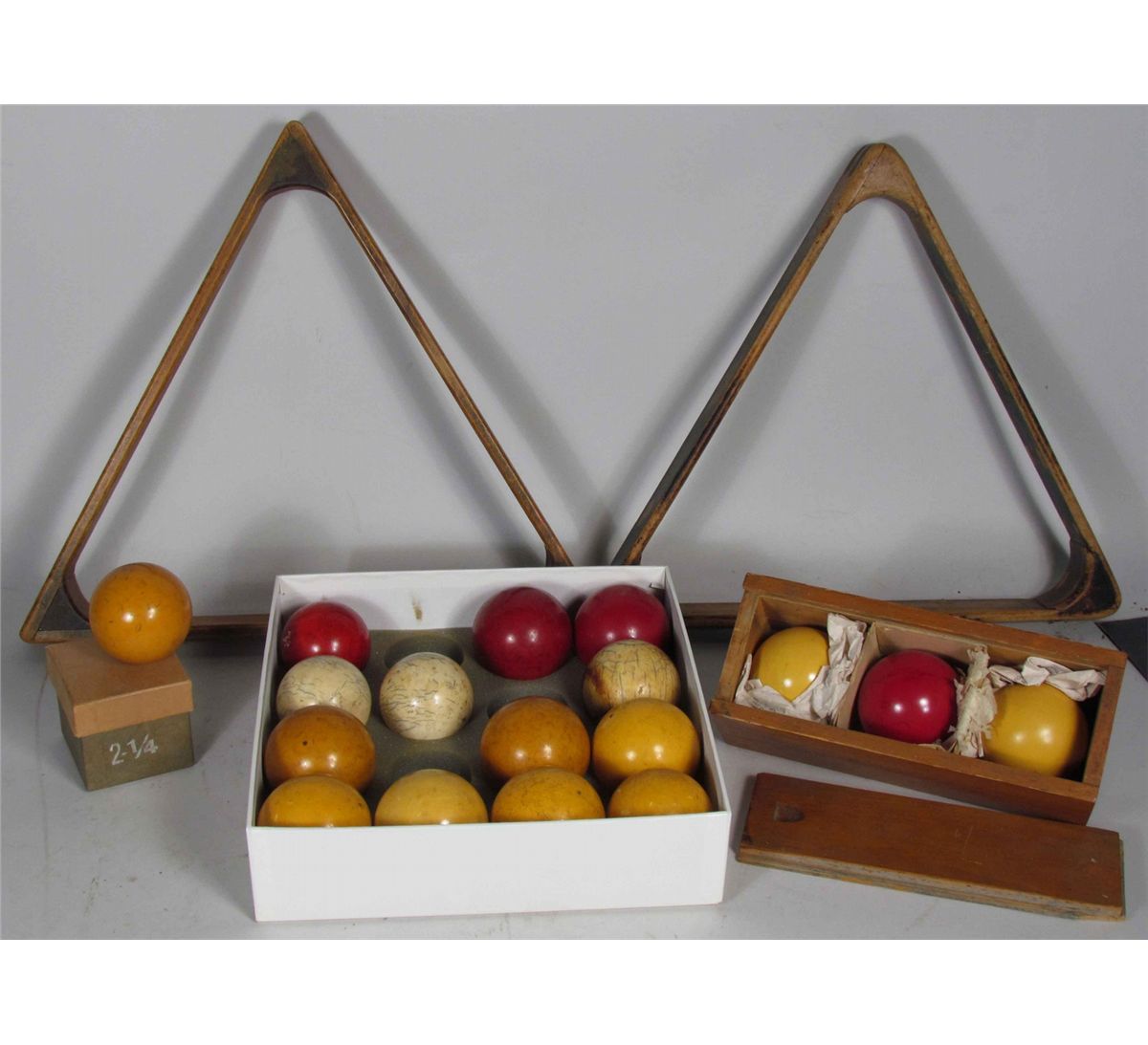 Miscellaneous Billiard Items including Brunswick Centennial Pocket Balls, Two Pool Ball Racks, One Ivory Q Ball, and Snooker Ball Set.