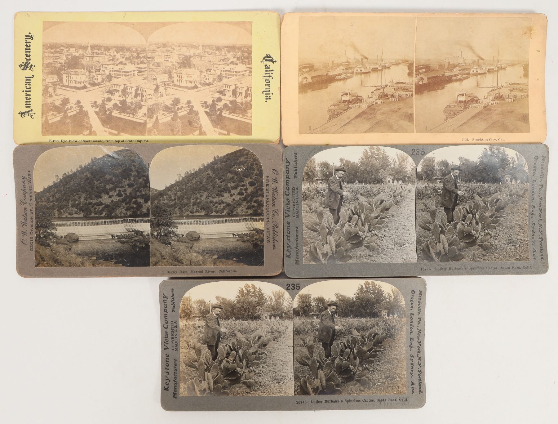 Lot of 5. Four different. Includes: bird's-eye of Sacramento from State Capitol; early view of river at Stockton City (by Kilburn); Bagby Dam, Merced River (ON Watson); and duplicate Keystone views of Luther Burbank's cactus in Santa Rosa.