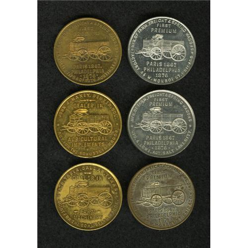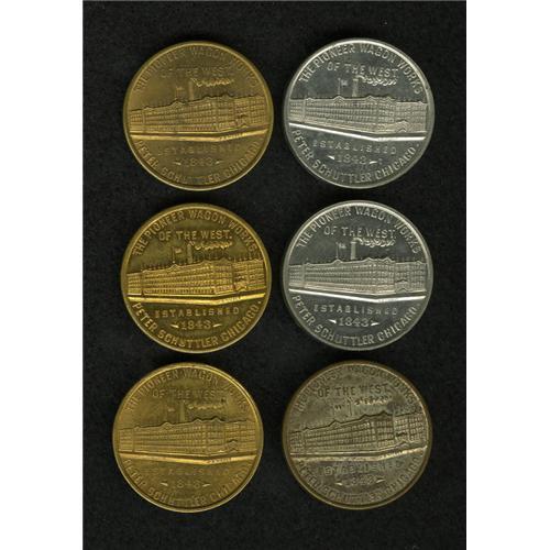 <B>Group Lot of Six Miscellaneous Chicago Trade Tokens.</B></I> Includes the following, all issued by Peter Schuttler of Chicago: Il-Ch 100, Il-Ch 100c (two), Il-Ch 100b, Il-Ch 115 and Il-Ch 106. Average grade is AU/Unc. Listed on pages 623 and 624 of the Rulau token catalog. Total value about $220-$250.