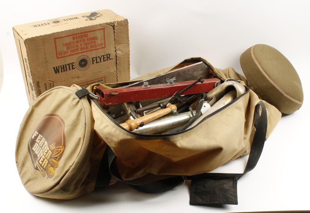 Includes 2 hand trap throwers, feather buster trap thrower (large unit where operator is seated), box of 90 Waite Flyer clay pigeons.