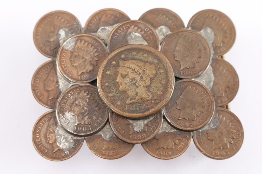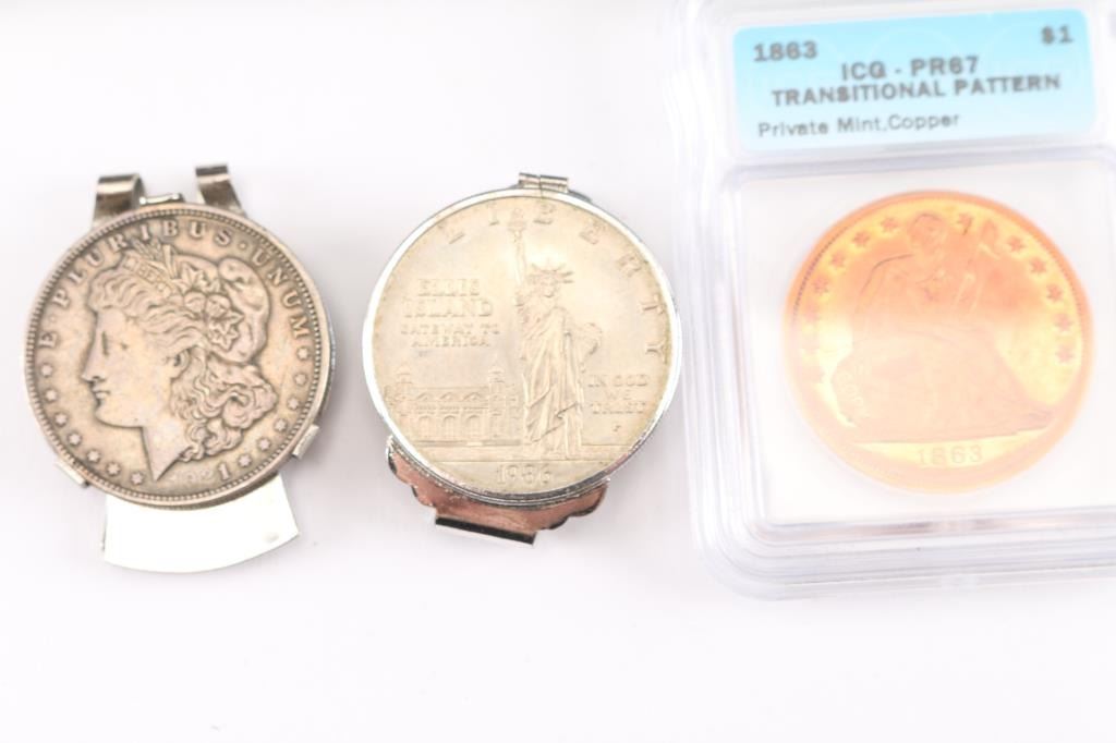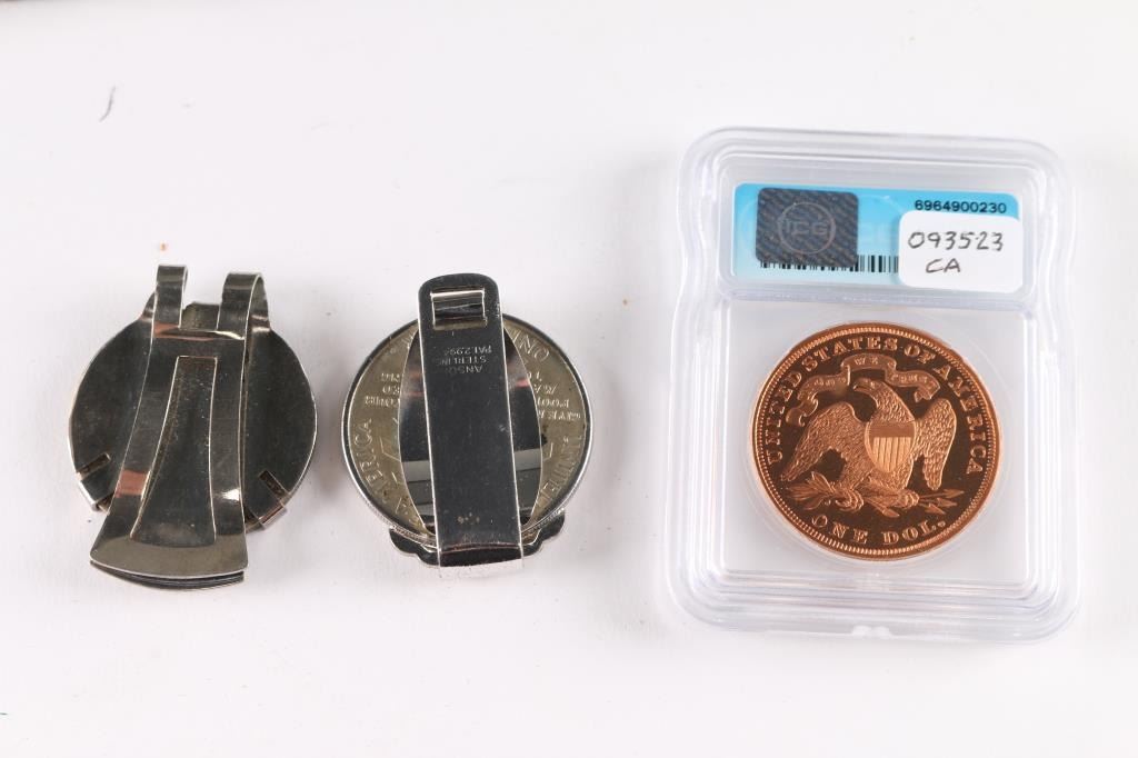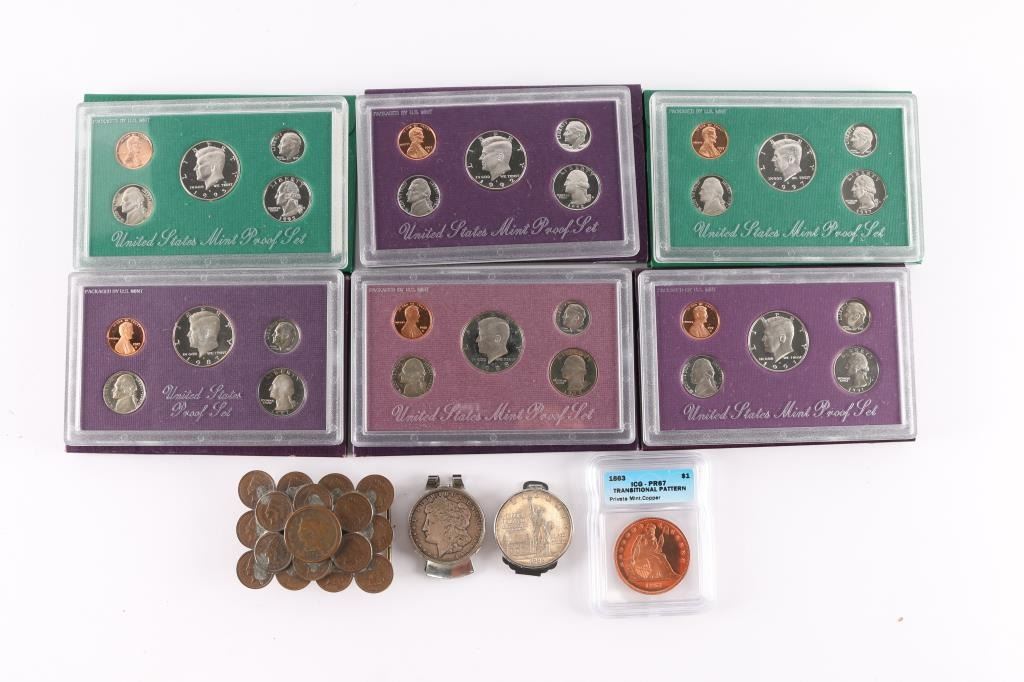 Includes: U. S. Proof Sets from 1987, 1988, 1991, 1992, 1995 and 1997. Also includes an 1863 Copper Private Mint Dollar. Also includes a 1986 Ellis Island one dollar sterling silver money clip and a 1921 silver dollar money clip. Also includes an indian head penny belt buckle.