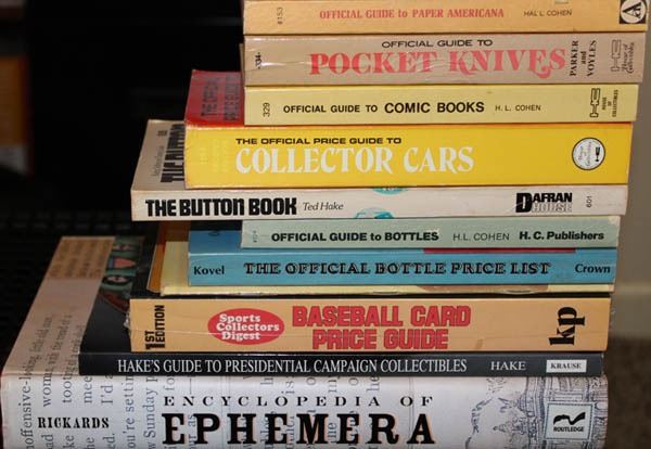Miscellaneous Collectibles, 11 different books, on baseball cards, bottles, buttons, collector cars, comic books, ephemera, paper Americana, pocket knives, and presidential campaign collectibles. Useful guides to these areas, with market pricing and illustrations. Shipping weight 12.75 lbs / 5.8 kilos. Estimate $100 - 150.
