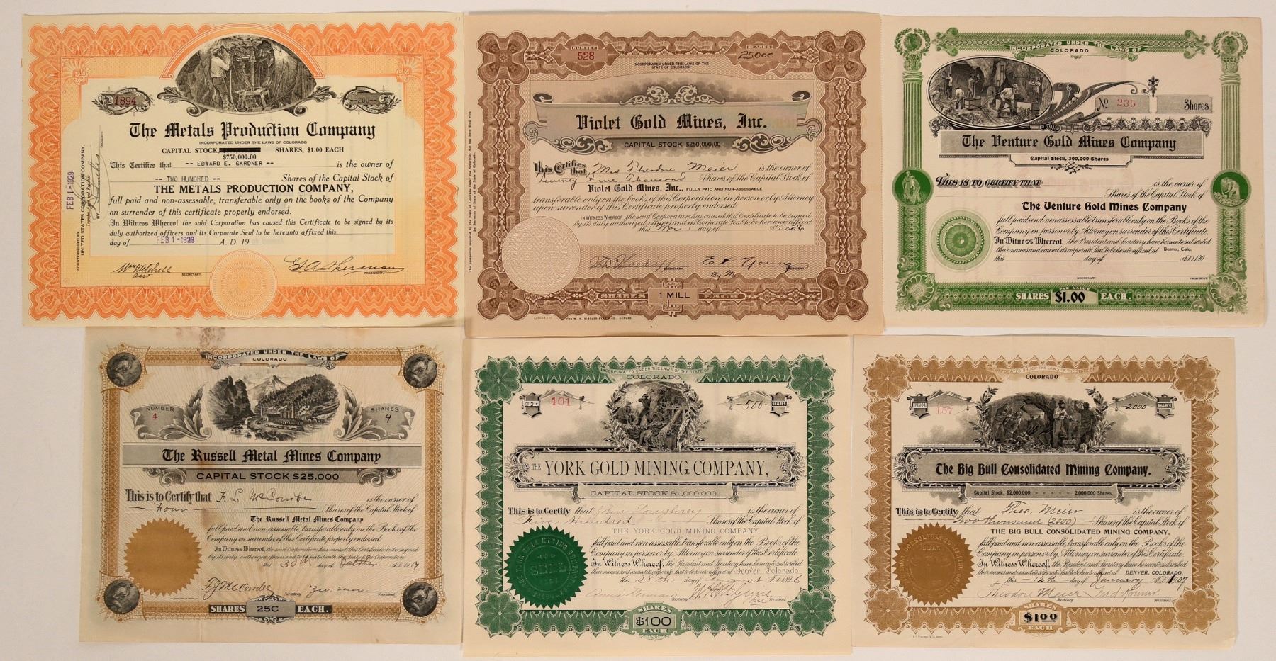 Lot of six. 1) York Gold Mining Company. Number 101 issued in 1896. Fraud! 2) Russell Metal Mines. NUMBER 4 for 4 shares. Issued to and signed by secretary McCombe. 1917. 3) Violet Gold Mines. 1926. 25,000 shares. 3) Venture Gold Mines. 190-. Unissued. 5) Metals Production Company. 1929.Four have mining vignettes. Mostly excellent: No pin holes, corner, edge or discoloration issues. State: Colorado City: Date: 1896-1929