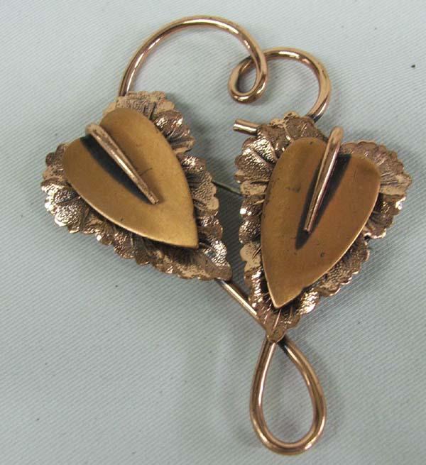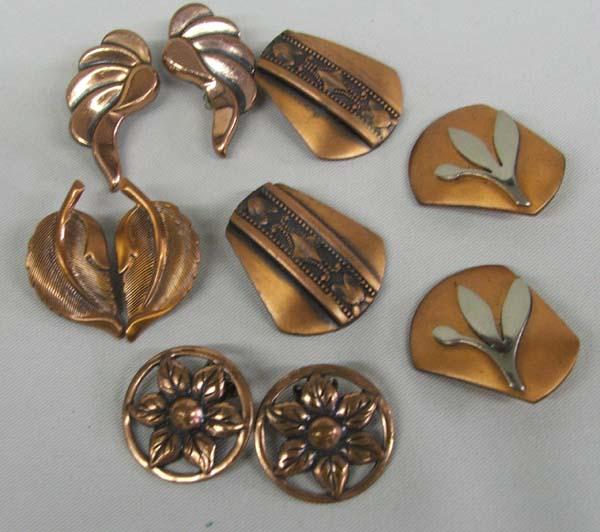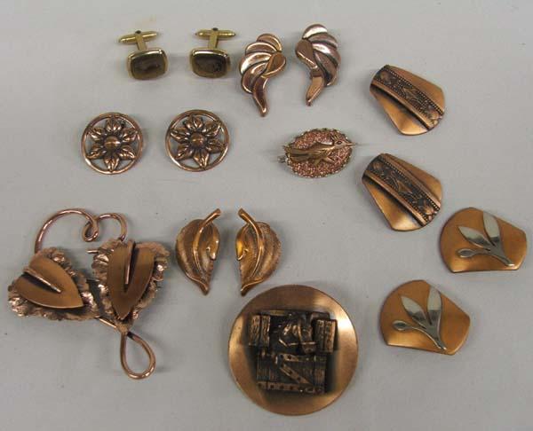 Miscellaneous Copper Jewelry. 3 pins, 5 pair earrings and 1 pair cuff links. Largest pin measures approx. 3'' x 2 1/2''. 14kt gold filled cuff links, Renoyr copper pin. Buyers Pay Actual Shipping and Handling Charges(see terms and conditions for more information).