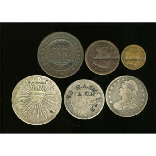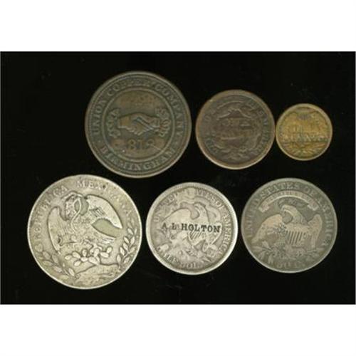 <B>Sextet of Counterstamped Coins.</B></I> Silver/copper. A mixed lot of U.S. and world coins, including Mexico and Great Britain, with a variety of counterstamps. A great starter collection.<BR><BR><b>Shipping:</b> Coins & Currency (<a target="_blank" href="http://www.heritageauctions.com/common/shipping.php">view shipping information</a>)