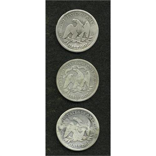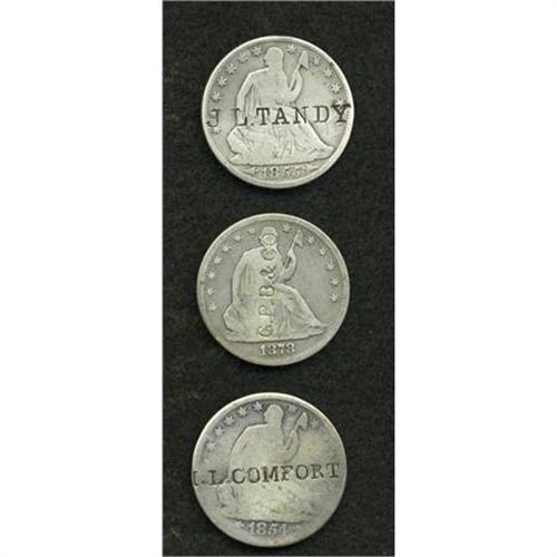 <B>Trio of Counterstamped U.S. Seated Liberty Halves.</B></I> Three counterstamped half dollars: <B>1854 Arrows I.L. Comfort; 1855-O Arrows J.L. Tandy; 1878 G.P.B. & Co. </B></I>A lot worthy of further research.<BR><BR><b>Shipping:</b> Coins & Currency (<a target="_blank" href="http://www.heritageauctions.com/common/shipping.php">view shipping information</a>)