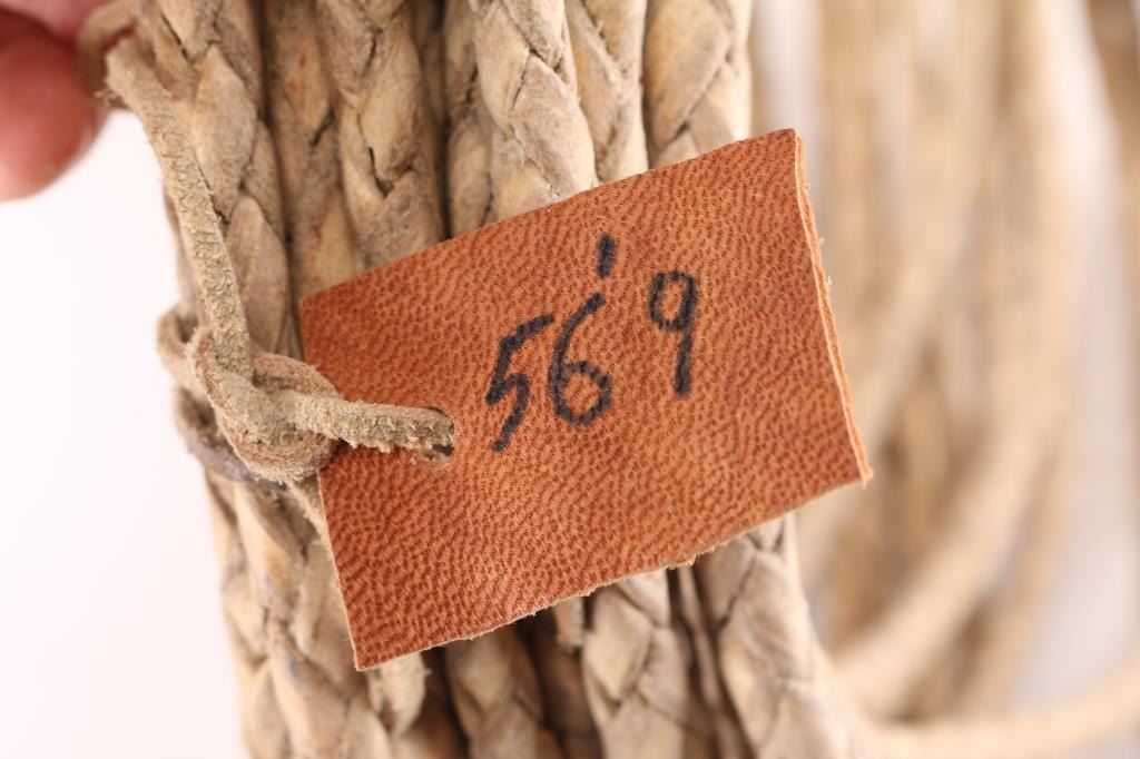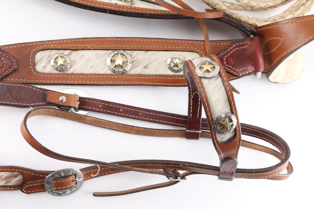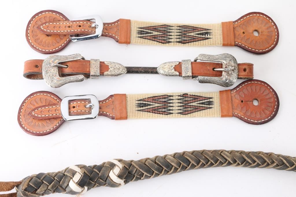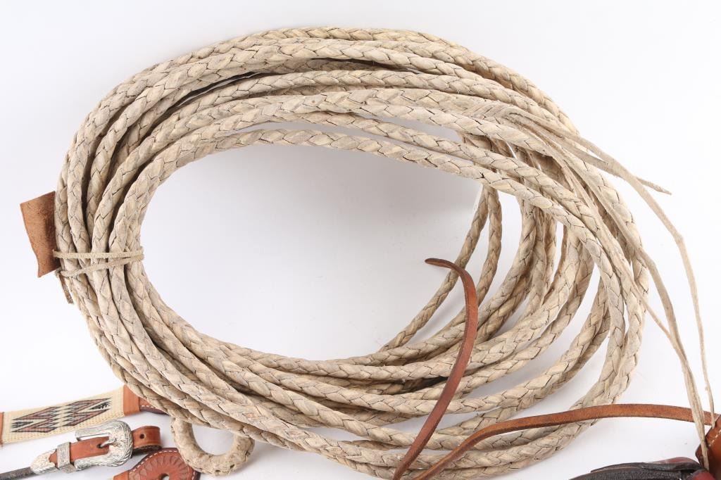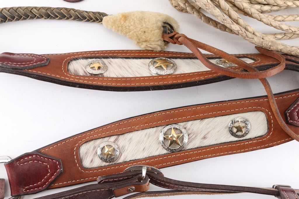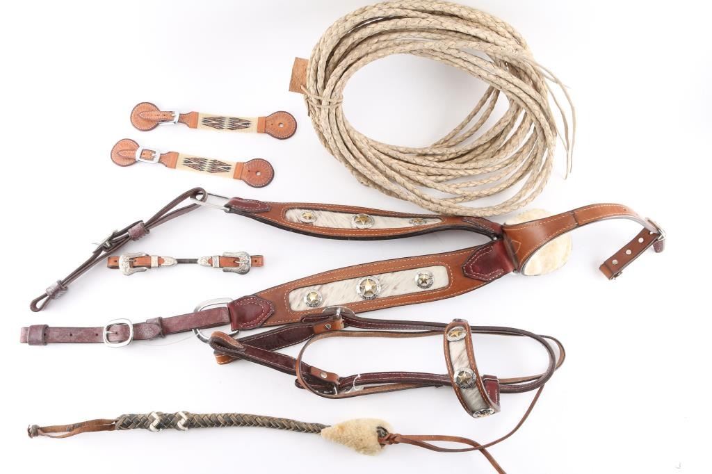 (1) Leather breast collar and head stall with cow hide accents. (1) Long braided leather reata. (1) Braided leather quirt. (1) Pair of horsehair spur straps. (1) Single leather spur strap.