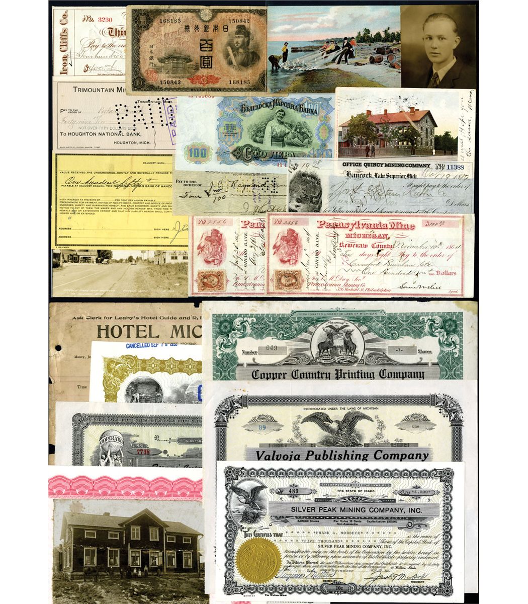 Includes 5 Stocks, Miscellaneous Postcards including a real photo ca. 1920-30's Osceola, MI street image; various issued checks and ephemera. Condition varies between VG to AU.