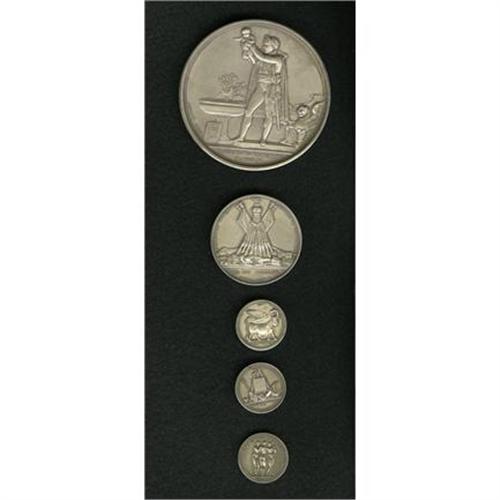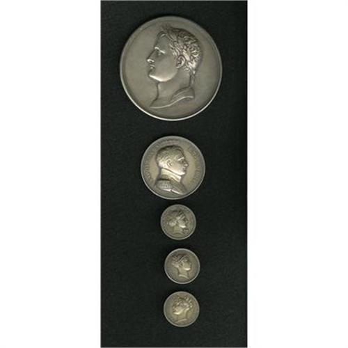 <B>Miscellaneous French Paris Mint Silver Medals (Napoleon I).</B></I> Five silver medals struck in the 19th century at the Paris Mint: one depicts Napoleon facing left, no inscription in the fields, about 68 mm, weight 152.3 gm, edge-stamped "argent" (silver), the reverse depicts him holding a baby, dated in Roman numerals MDCCCXI (1811), commemorating the baptismal of his son; a piece commemorating the Battle of Wurtchen, May 21, 1808, a later restrike in silver, edge-stamped argent, about 41 mm, weight 35.8 gm; and three pieces struck at the Paris Mint depicting Greek women, commemorating various themes. The market value is about $150-$250.<BR><BR><b>Shipping:</b> Coins & Currency (<a target="_blank" href="http://www.heritageauctions.com/common/shipping.php">view shipping information</a>)