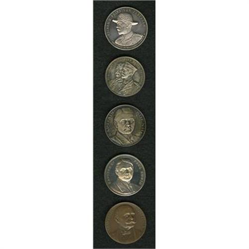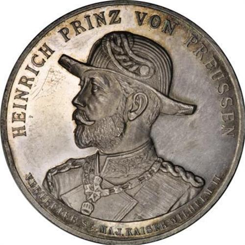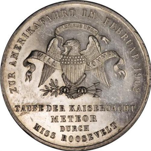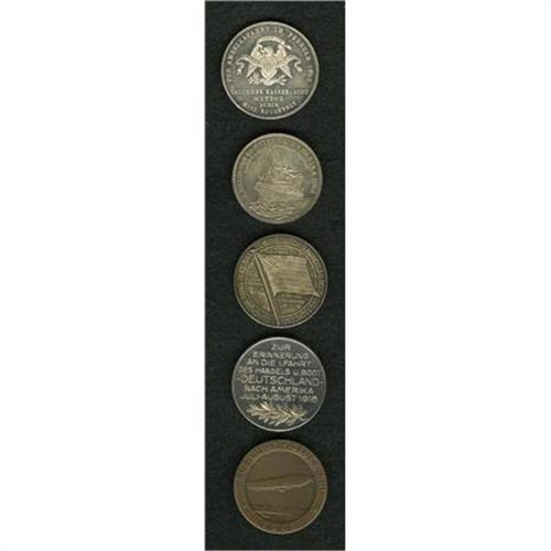<B>Quintet of German Pre-World War I Medals.</B></I> Silver/bronze. An outstanding group lot including: two silver medals featuring the Crown Prince of Germany on his visit to the United States in 1902, one with Teddy Roosevelt; two silver medals featuring Captain Paul Koning, captain of the submarine <I>Deutschland</B></I> on its voyage to the United States in 1916; and a bronze medal featuring the Graf Zeppelin, dated 1909.<BR><BR><b>Shipping:</b> Coins & Currency (<a target="_blank" href="http://www.heritageauctions.com/common/shipping.php">view shipping information</a>)