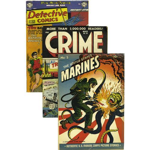 <B>Miscellaneous Golden Age Group (Various Publishers, 1944-51).</B></I> Included here are <B>A-1 Comics</B></I> #nn (featuring Kerry Drake; GD-); <B>Crime Does Not Pay</B></I> #50 (FN), 60 (VG-), 71 (VG+), and 72 (FN); <B>Daredevil Comics</B></I> #35 (GD/VG) and 60 (VG/FN); <B>Detective Comics</B></I> #173 (GD; 3-inch tear on front cover); <B>Sweethearts</B></I> (Fawcett series) #72 (VG); United States Marines #nn, 3 (Tojo cover) and 4 (average VG); and <B>Wonder Woman</B></I> #10 (FR with one-fourth of front cover missing). Approximate Overstreet value for group = $550. <I>From the Collection of Harold Curtis.</B></I>