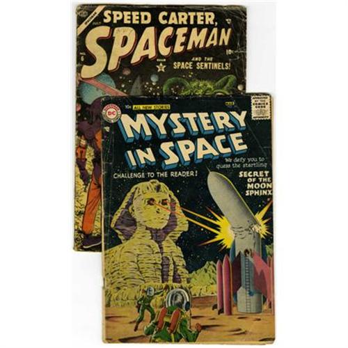 <B>Miscellaneous Golden Age Sci Fi Comics (Various Publishers, 1954-57) Condition: Average GD.</B></I> Two-book set includes <B>Spaceman </B></I>#6 (grey tone cover by Joe Maneely) and <B>Mystery in Space </B></I>#36 (Gil Kane cover, Kane and Carmine Infantino art). Approximate Overstreet value for group = $75.<BR><BR><b>Shipping:</b> Comics - Unslabbed (<a target="_blank" href="http://www.heritageauctions.com/common/shipping.php">view shipping information</a>)