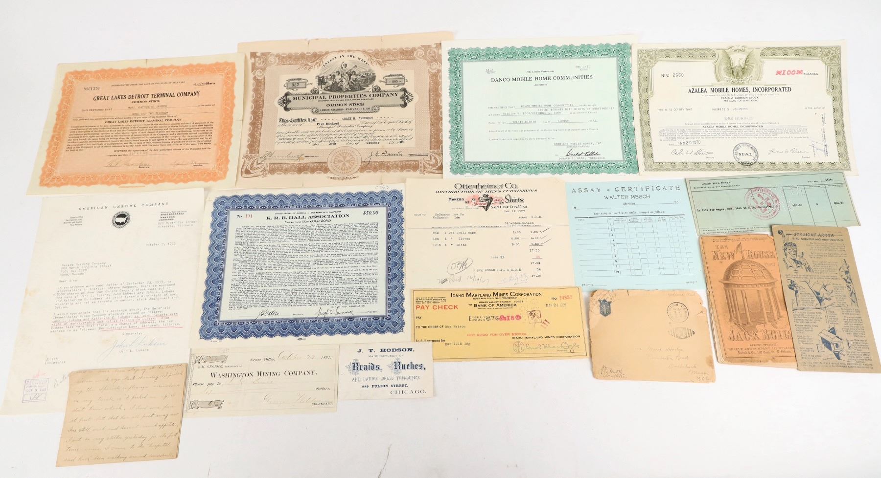 Lot of about 22 items including mining checks (incl. rare 1858 pictorial Tuolumne County Water Co.), stocks, an Adams Express Co. receipt (1881), business card, assay certificate, letter, booklet, and more. Please see photo.
