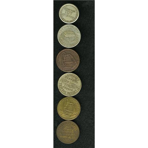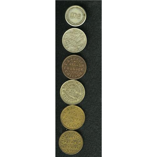 <B>Group Lot of Six Miscellaneous Chicago Merchant Tokens.</B></I> Includes the following tokens, all listed by Rulau numbers: Grenier's, II-Ch-29; F.A. Jensch, Il-Chi-53, Copper; F.A. Jensch Il-Ch-54, Brass; Lyceum Theatre Il-Ch-60; N.W. Showcase Mfg. Il-Ch-69; and N.W. Showcase Mfg., Il-Ch-70. A nice Illinois group.