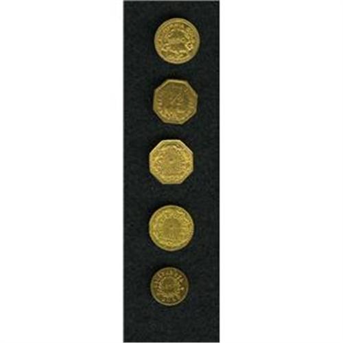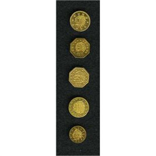 <B>Miscellaneous Group Lot of "Gold" California Charms.</B></I> Gold. Included are four one dollar-size and one quarter dollar-size gold charms (jeweler's pieces) dating from 1850-1860. Nice lot.<BR><BR><b>Shipping:</b> Coins & Currency (<a target="_blank" href="http://www.heritageauctions.com/common/shipping.php">view shipping information</a>)