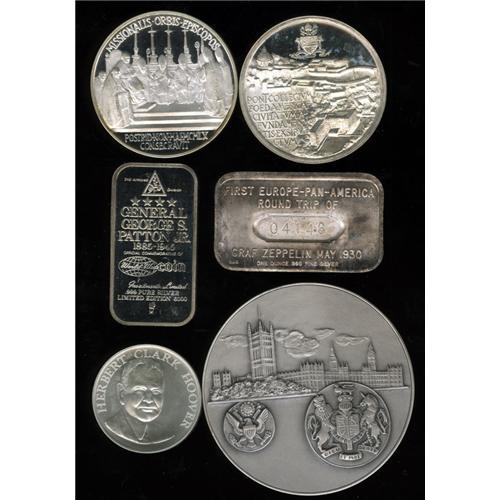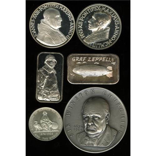 <B>Miscellaneous Group Lot of Silver Medallions.</B></I> Six silver items: a 1953 Pope Pius XII silver medallion; a Pope John XXIII silver medallion; a large .999 154.7-gm silver medallion issued to commemorate the life of Winston Churchill (1874-1965); two .999 fine silver art bars (General Patton and the Graf Zeppelin); and a Herbert Hoover so-called half dollar. The total weight is close to 10 oz.; the market value is about $125-$175.<BR><BR><b>Shipping:</b> Coin/Currency (<a target="_blank" href="http://www.heritageauctions.com/common/shipping.php">view shipping information</a>)