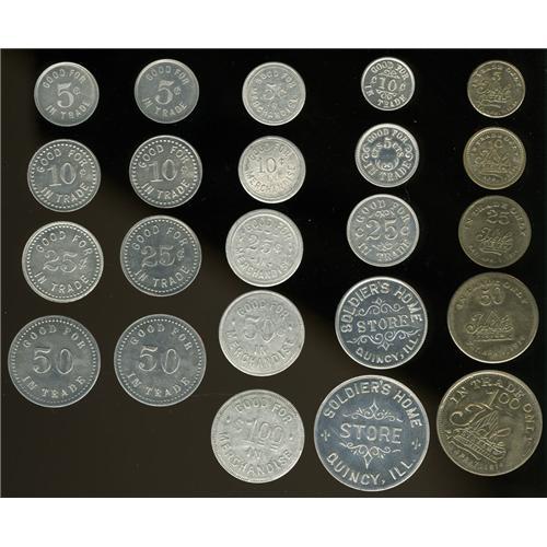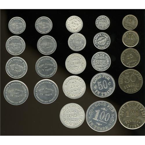 <B>Miscellaneous Group Lot of Store Tokens.</B></I> Includes a set of tokens from Frankfort and Emmett, Kansas; Strub, South Dakota; Louis Kuligowski (manufactured by Ingle); and a set issued for the Old Soldiers Home, Quincy, Illinois. The current market value is about $100-$150.<BR><BR><b>Shipping:</b> Coin/Currency (<a target="_blank" href="http://www.heritageauctions.com/common/shipping.php">view shipping information</a>)