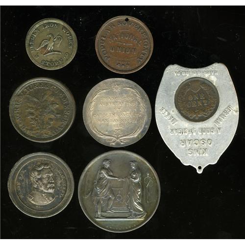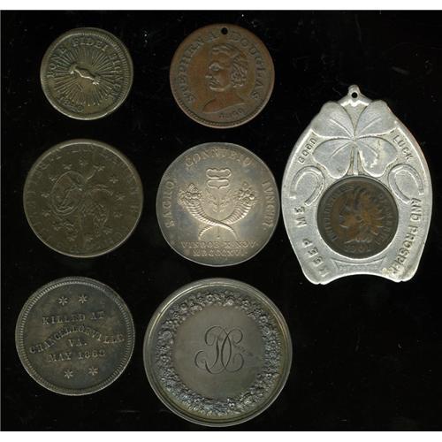 <B>Miscellaneous Group Lot of Tokens.</B></I> A variety of tokens and medals that will appeal to a wide array of collectors: a silver medal commemorating Major General H.G. Berry, killed in the battle of Chancellorsville, Virginia, during the Civil War, silver; an 1860 political token for the election of Stephen Douglas for president, a scarce and seldom-seen token, struck by the Chicago firm of F.A. Jensch & R. A Meyer; a Hard Times token, HT-204, Breton 670, issued by T. Duseaman of Belleville, New Jersey; and an encased 1901 Indian cent, a French silver wedding medal, an 1816 Austrian wedding medal, and a piece issued by the Bergen Iron Works, HT-206, Very Fine+. An outstanding lot that must be seen to be appreciated.<BR><BR><b>Shipping:</b> Coin/Currency (<a target="_blank" href="http://www.heritageauctions.com/common/shipping.php">view shipping information</a>)