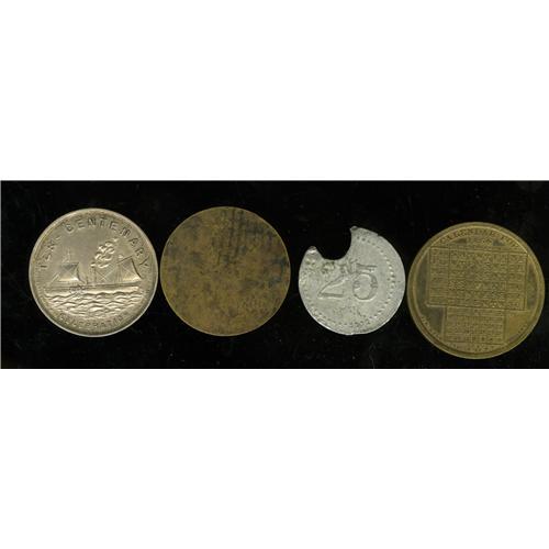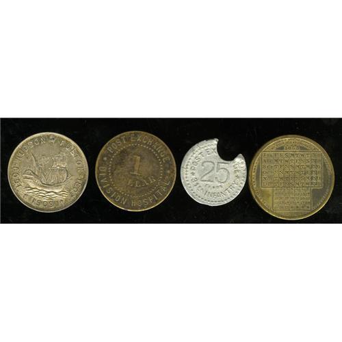 <B>Miscellaneous Group Lot of Tokens.</B></I> Four pieces. Two U.S. military tokens used in the Philippines prior to World War II: a Good for One Dollar at the Post Exchange Divisional Hospital, with a blank reverse, and a piece used by the 31st Infantry at the Post Exchange, unlisted with the denomination 25 cents, cancelled with part of the token missing; an 1853/1854 calendar struck in brass by J. B. Hyde, Fulton Street, New York, publisher; and a piece struck in silver to commemorate the 1609-1909 tercentenary celebration of the Hudson-Fulton, with no manufacturer's name but a copyright date and a patent applied for, about 32 mm, weight 16.7 gm, with the word "sterling" edge-stamped.<BR><BR><b>Shipping:</b> Coins & Currency (<a target="_blank" href="http://www.heritageauctions.com/common/shipping.php">view shipping information</a>)