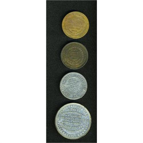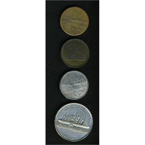 <B>Four Tokens of the</B></I><B><I> Great Eastern </B></I></B></I><B>Steamship.</B></I> Includes: <B>41-mm white metal medal</B></I> with detailed information on the <I>Great Eastern </B></I>steamship; <B>31-mm brass medal </B></I>commemorating the arrival of the ship from England in 1860; <B>31-mm white metal medal </B></I>with the same obverse as the brass piece, but a different reverse (purchased onboard the <I>Great Eastern</B></I>), dated 1860; and a<B> 31-mm brass-plated white metal medal, </B></I>obverse with the ship, date 1859 below, reverse describes the ship. A neat group that should attract nautical collectors.<BR><BR><b>Shipping:</b> Coins & Currency (<a target="_blank" href="http://www.heritageauctions.com/common/shipping.php">view shipping information</a>)