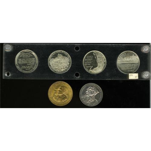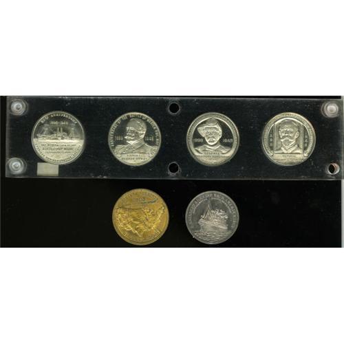 <B>Miscellaneous Group Lot of Tokens and Medals.</B></I> Six different tokens: four issued in 1948 to commemorate the Battleship Maine, Admiral Dewey, Teddy Roosevelt and Admiral Sampson, all housed in a clear plastic holder, all Uncirculated; a so-called dollar, HK-304; and a silver (.990 fine) medal commemorating the visit of the German Crown Prince Heinrich in 1902, featuring President Theodore Roosevelt and the crown prince, and outstanding proof silver medal that medal collectors should not overlook. The market value is approximately $125-$200.<BR><BR><b>Shipping:</b> Coins & Currency (<a target="_blank" href="http://www.heritageauctions.com/common/shipping.php">view shipping information</a>)