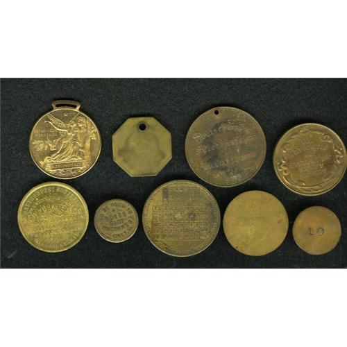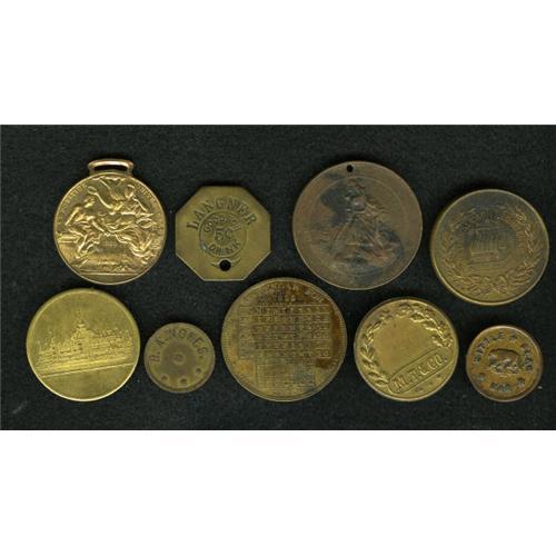 <B>Miscellaneous Token Group.</B></I> Includes: Little Bear Bar 10; M T & D Brass uniface token (no value); a Langner Good For 5 ct Drink; a R.A.Nokes slot machine token; a Toon & Hollingshed Co Hub Club; a Saengerfest 1886 Milwaukee, Wisconsin, Wi-Mi-51a; a Deutschland's Fried, Williamsburgh, New York, 1871, NY-Wm 4; a N.J. Schloss & Co., New York, 1889, gilt copper, NY-NY A270; a National Cash Register Co (NCR) 1890s, copper; and a very scarce T. Sperry, New York, 1854-55, brass calendar medal. An extremely interesting group. Viewing is recommended.