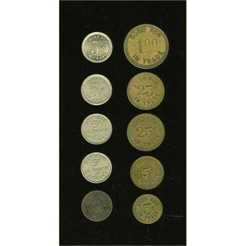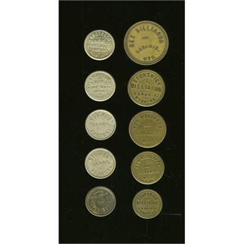 <B>10 Western U.S. Tokens.</B></I> Nickel/brass $1.00, 25 cents, 5 cents merchant tokens issued by <B>Rex Billiards</B></I> of Laramie, Wyoming; 25 cents and 5 cents brass tokens issued by <B>Brunswick Billiards,</B></I> Laramie, Wyoming; two 5 cent tokens issued by <B>Anderson Candy Co., </B></I>Globe, Ariz.; two 5 cents tokens issued by <B>Keegan's,</B></I> Globe, Arizona; and a brass token issued by <B>C.J. Carlstrom</B></I> of Hamilton, Mont., good for one drink or cigar.<BR><BR><b>Shipping:</b> Coins & Currency (<a target="_blank" href="http://www.heritageauctions.com/common/shipping.php">view shipping information</a>)