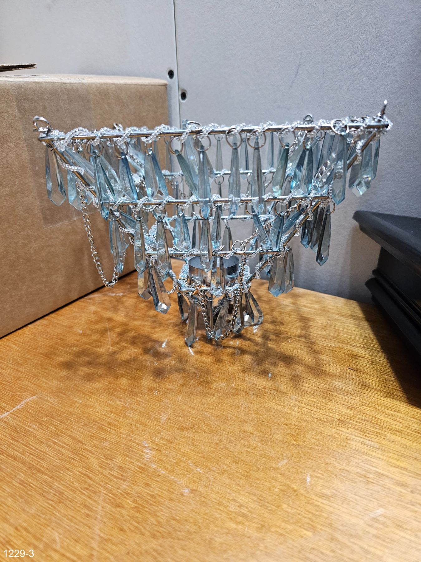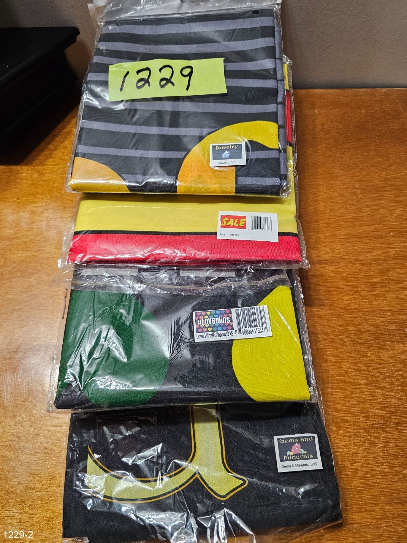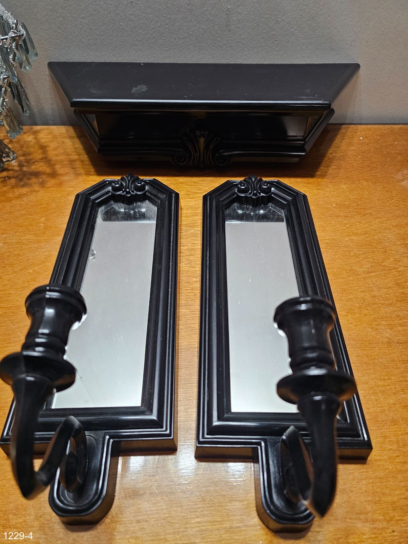 Miscellaneous Items Including Four unopened 'Sale' and 'Merchandise Flags, two appetizer plates, Two Mirrored wall Sconce Candle Holders, Black Shelf, Hanging Tea Light Holder