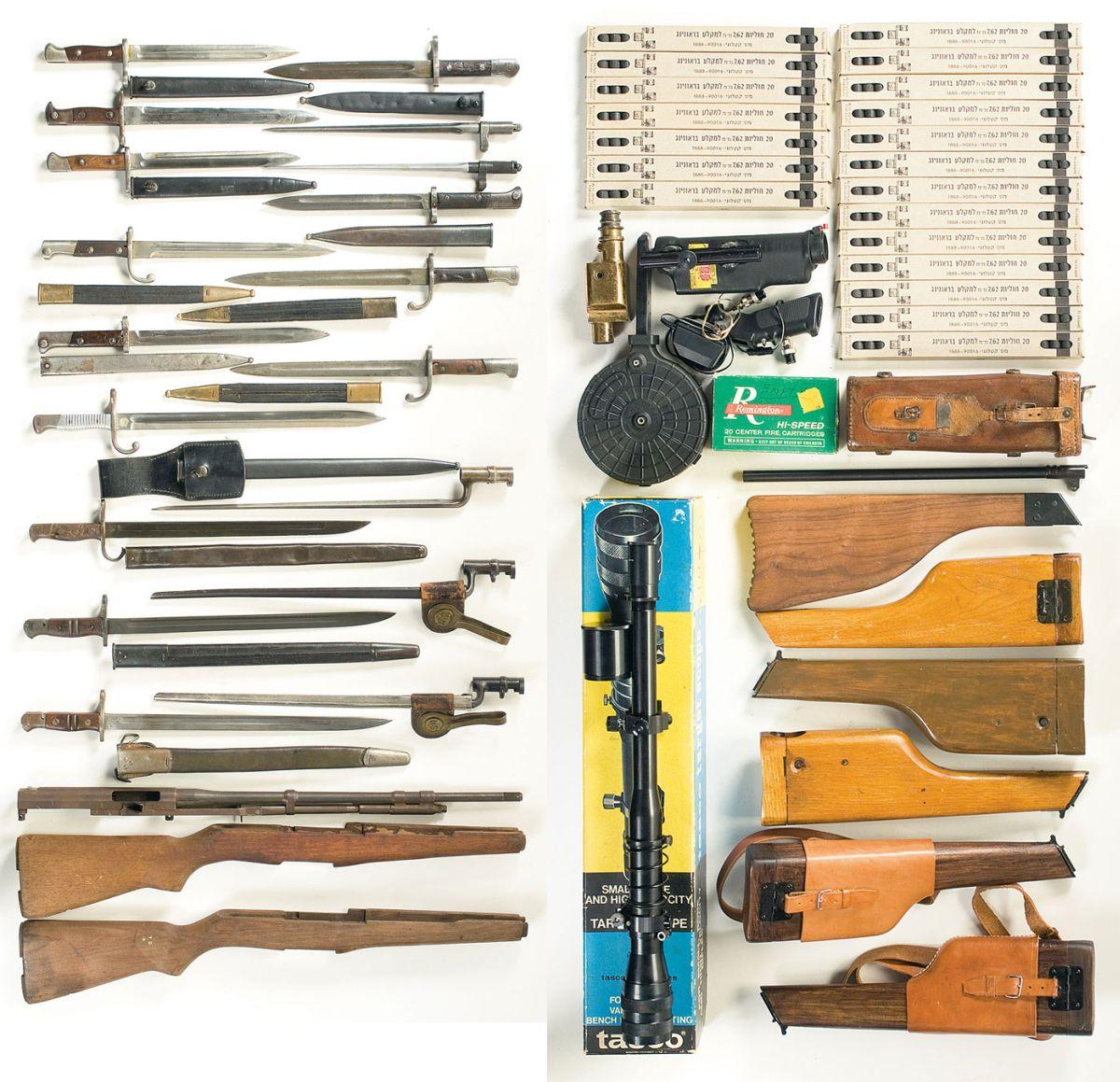 This lot has what consignor states is a prototype action base with Harrington & Richardson barrel, purchased when Navy Arms bought H&R lab (overall has a smooth plum patina). Includes: 7.65mm cartridge links, 2 commercial M1 Garand stocks (poor), Tasco 20x40mm target scope with box (excellent), about 18 assorted U.S. and foreign bayonets (good to very good, with many having cleaned/sharpened blades), 5 refinished/repaired Broomhandle pistol wooden stocks holsters, wooden pistol shoulder stock, Model 1913 telescopic musket sight, laser sight for AR-15 with grip.