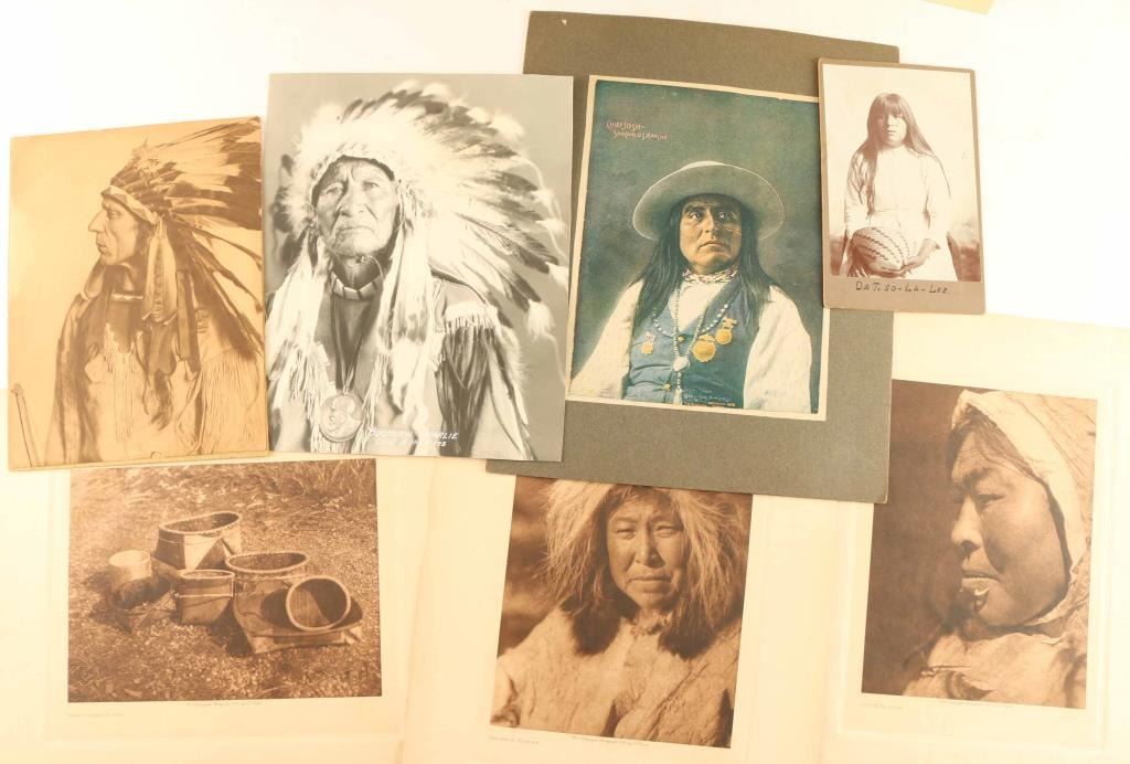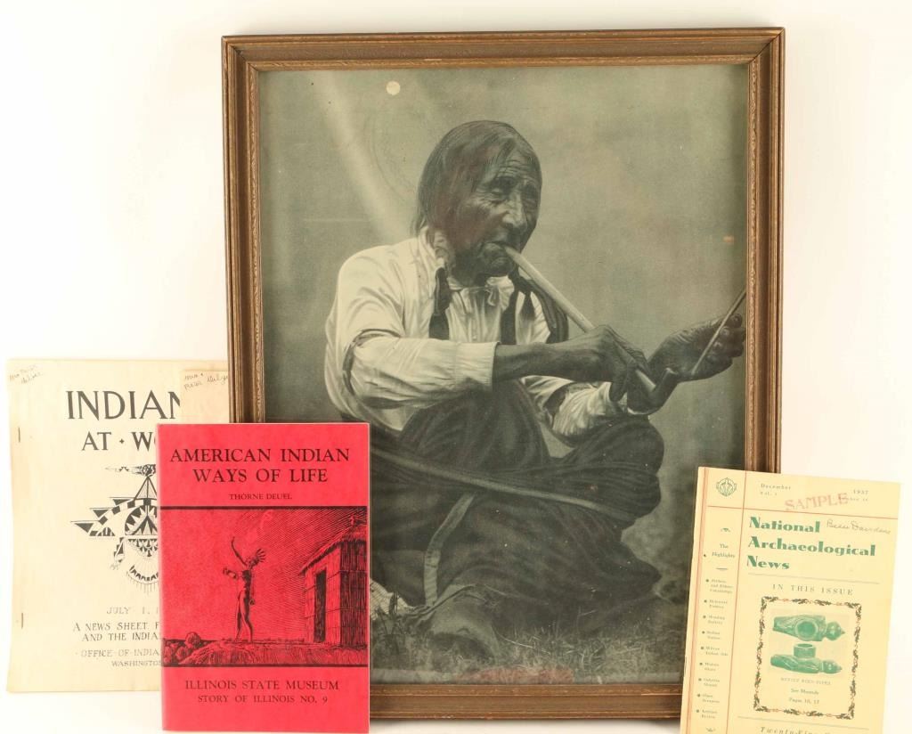 Including; 'National Archaeological News' December 1937, 'American Indian Ways of Life' by Thorne Deuel, 'Indians at Work' by Office of Indian Affairs Washington, D.C. June 15,1937 and July 1,1937. Also includes prints and photos of Native Americans, one framed of man smoking a pipe.