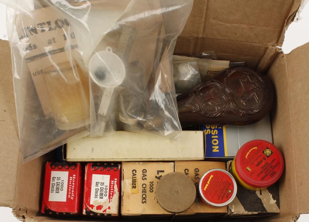 Lyman gas checks: .30, .38, .458; Hornady gas checks: .22, .25, .35, 6mm; CCI percussion caps No 11; Flobert 6mm BB caps; Dynamit Nobel percussion caps; Remington percussion caps; misc black power accessories including: powder measure, 3 cappers, bear grease, wads, and small funnel.