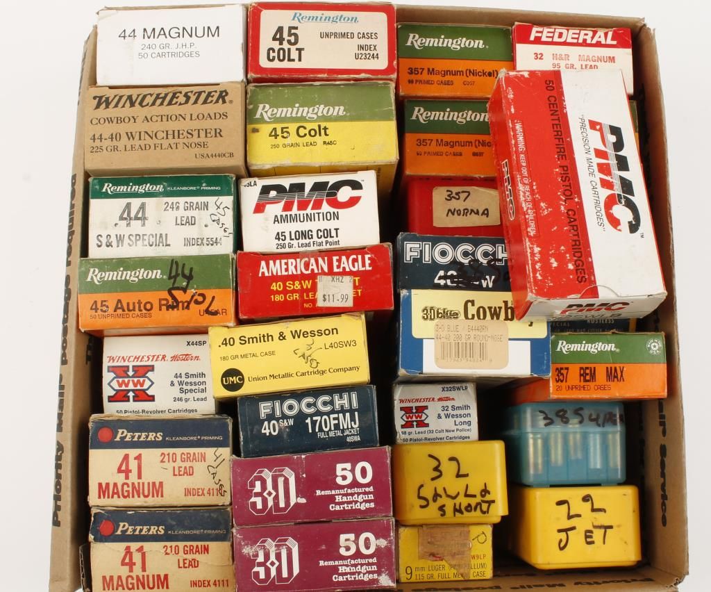 Includes .44 mag, .44-48, .44 spl, .41 mag, .45 Colt, .40 S&W, .357 mag, .32 S&W L, .38 S&W, .32 H&R mag, .38 Colt auto, .380, 9mm, .357 max, .38 super, .22 Jet, .45 auto rim, partial box 9mm Luger