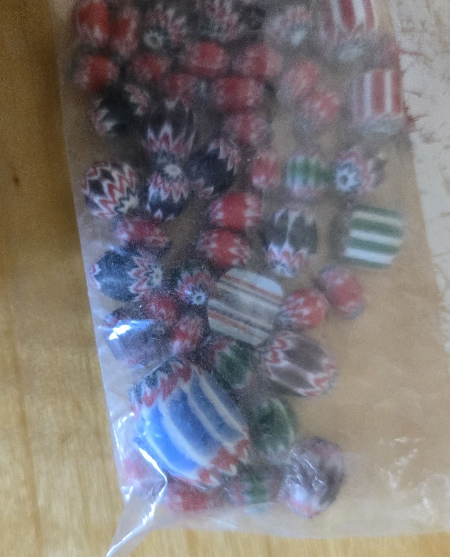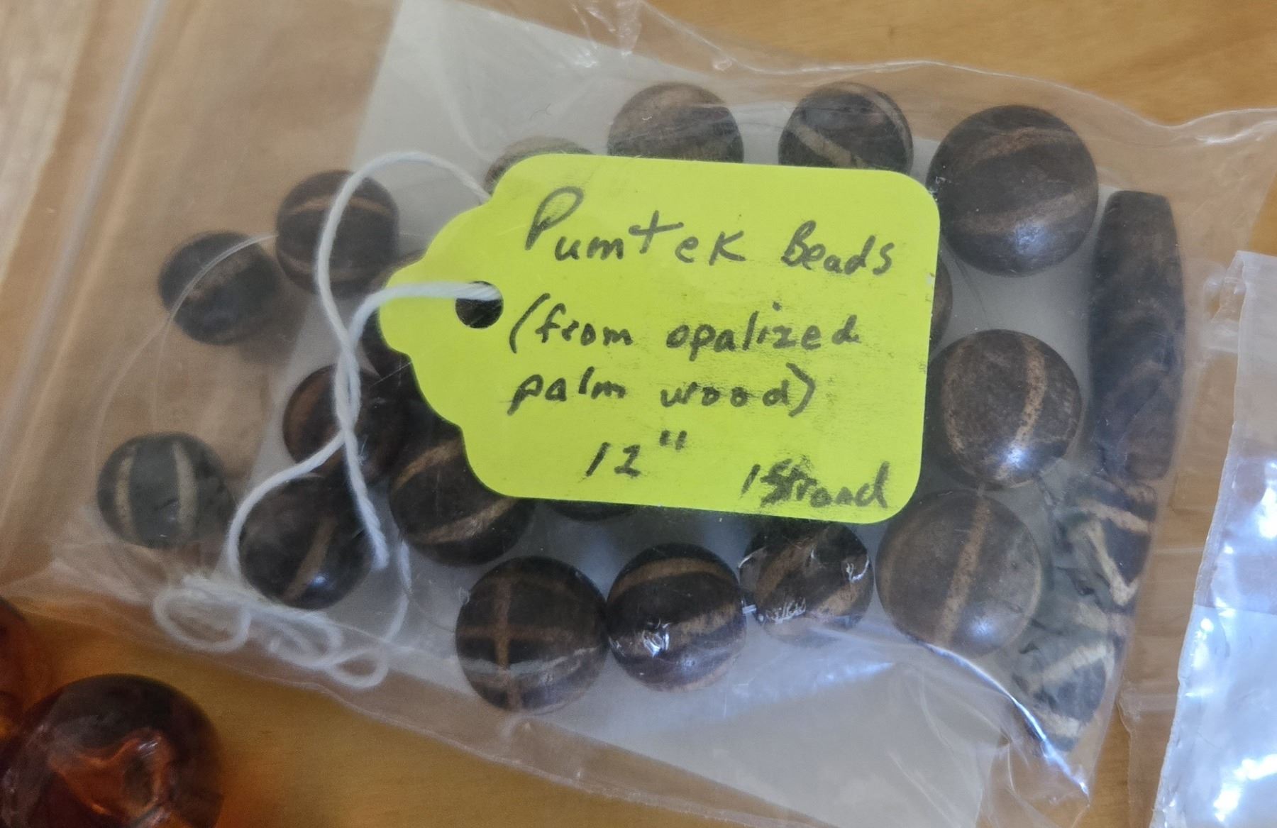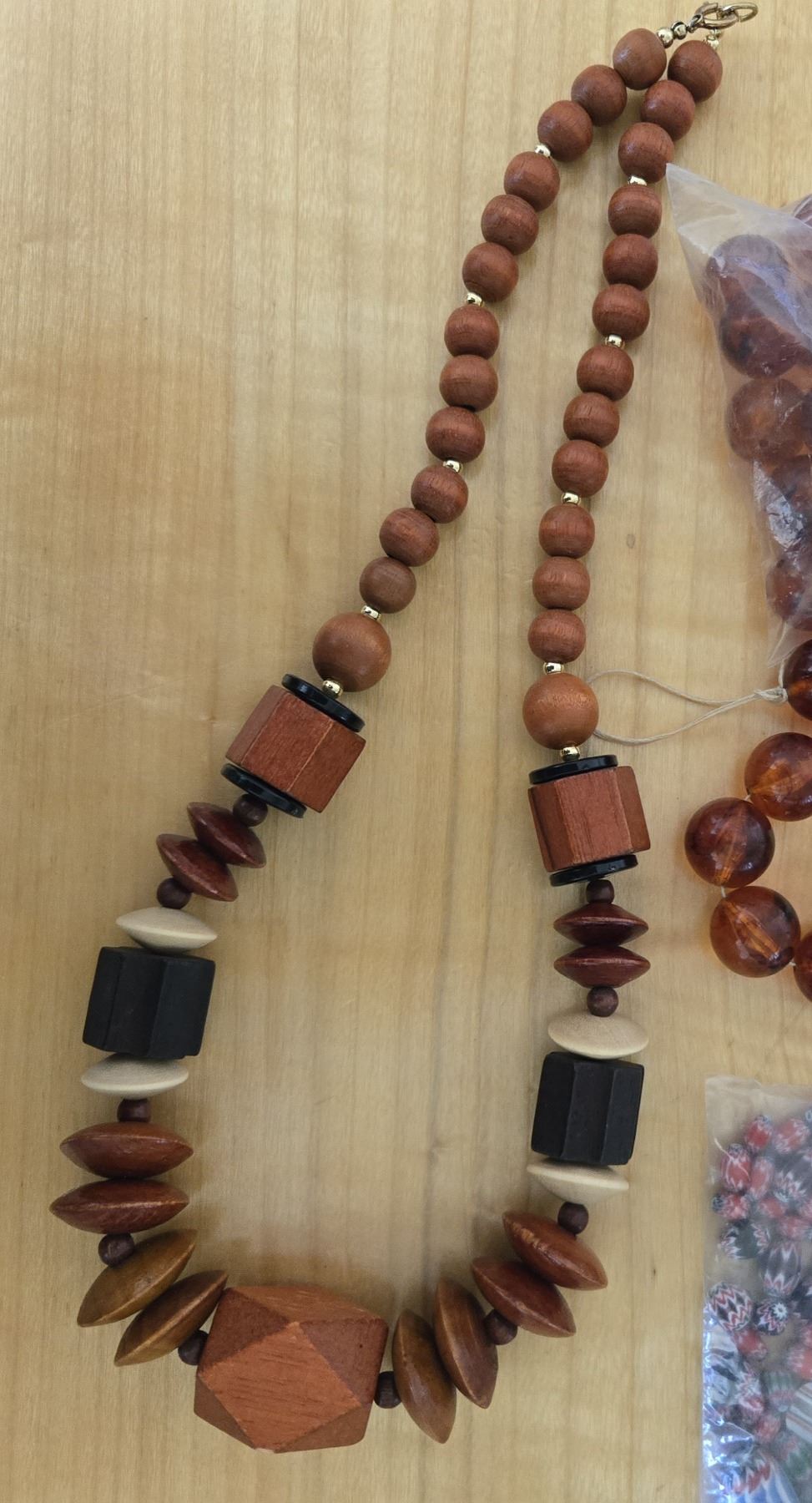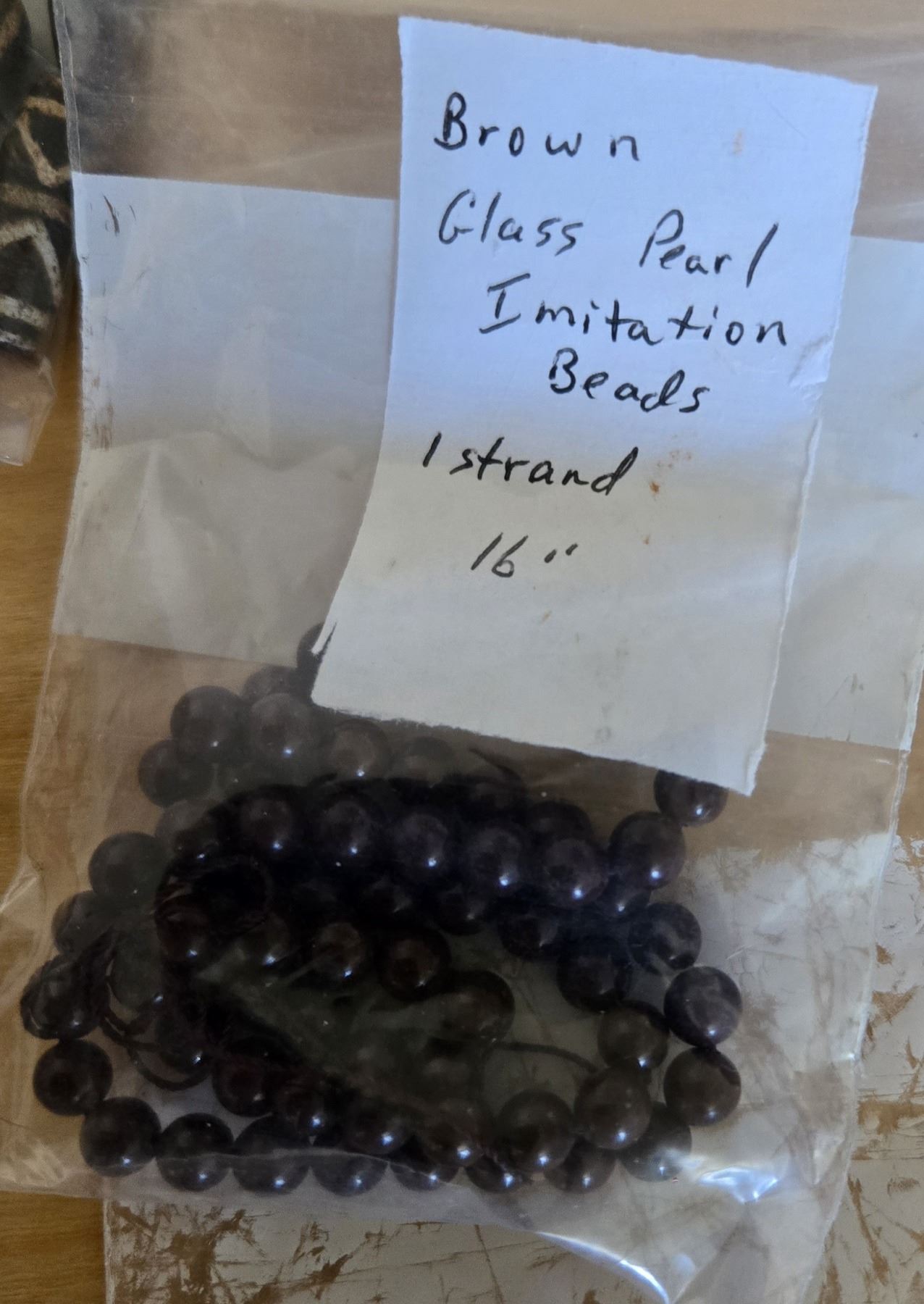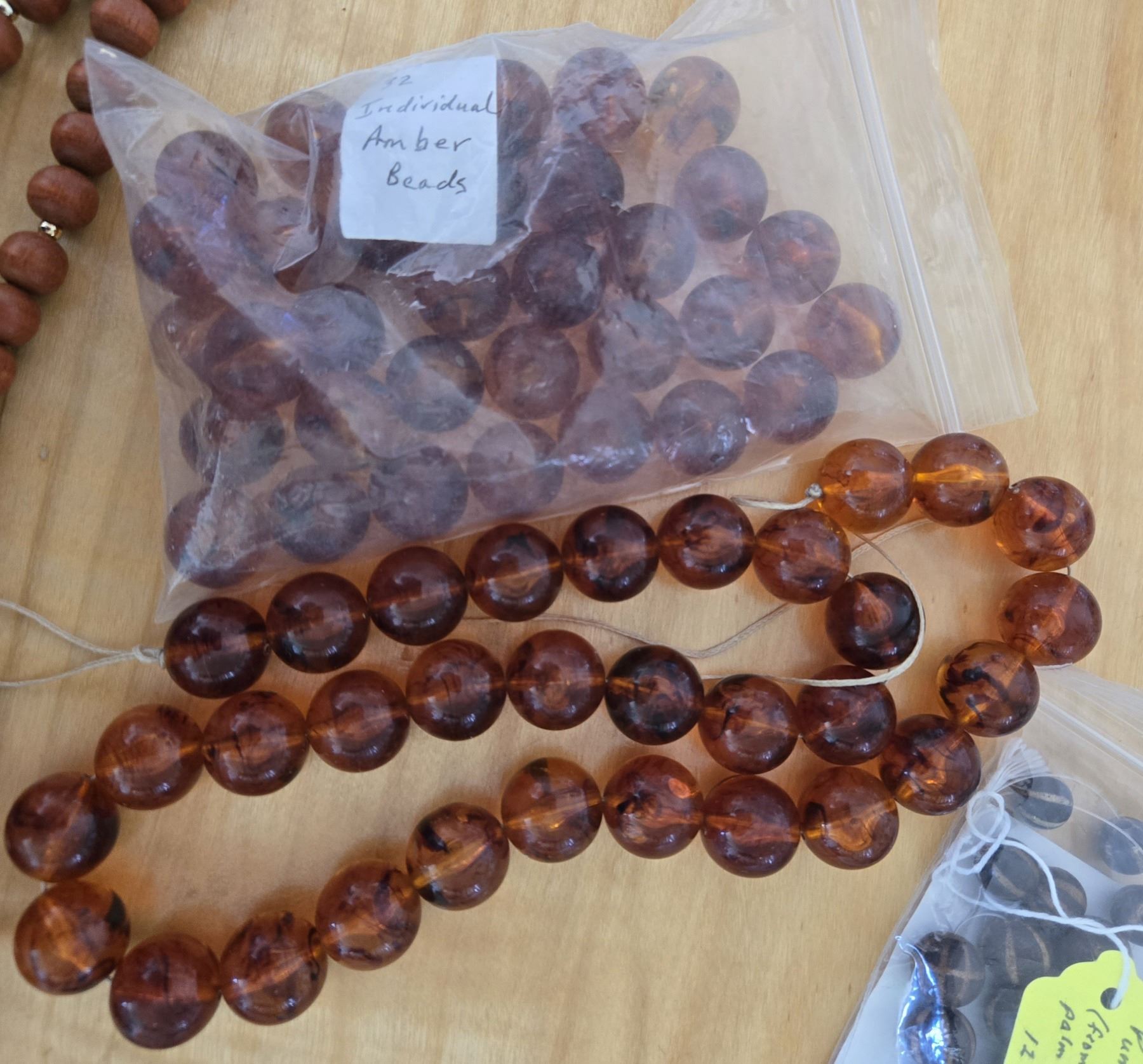 Miscellaneous Lot of Trade Beads and One Wooden Bead Necklace. Lot includes one Malaysian wooden necklace, two bags of amber colored beads, one bag of assorted chevron beads, two bags of brown glass imitation pearl beads and one bag of palm wood beads.