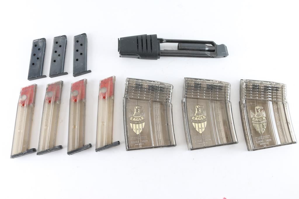 1) a like new, in wrap, blued steel magazine assembly for Russian "Drozd" BB gun. 2) Three magazines for Bryco 380 pistol 3) Four polymer mags for Ramline 22 cal pistol 4) Three polymer 10 rd magazine for Remington 740,743,7400,760,7600 rifles, 243/308 cal