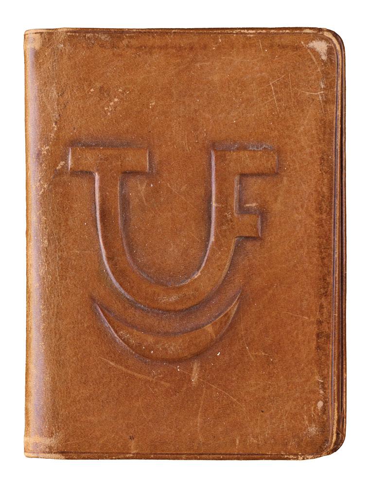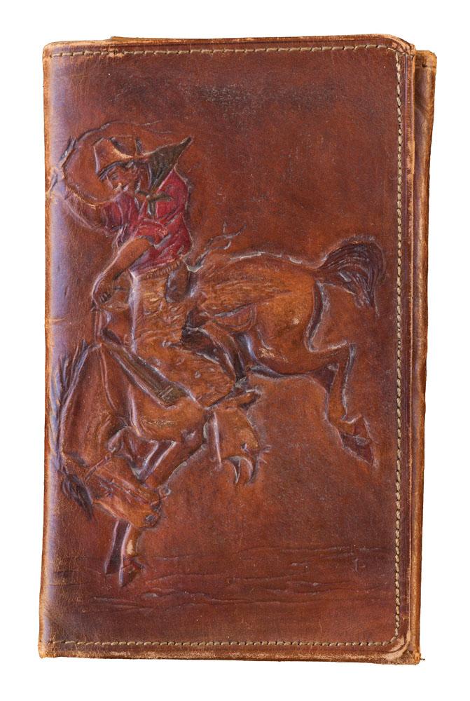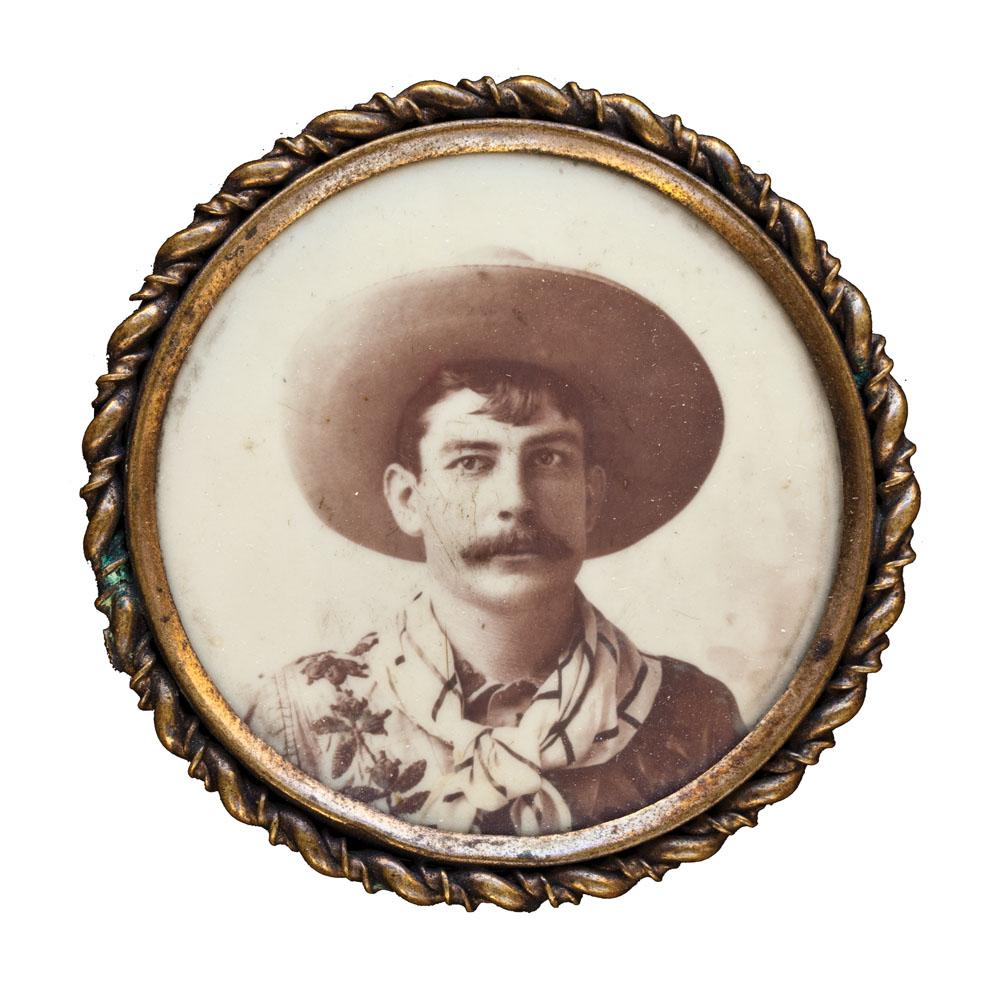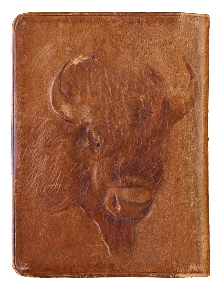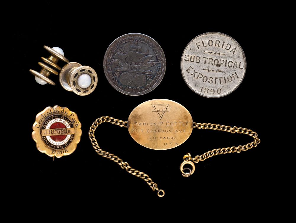 a) Brass Gaucho buckle with chains, Republica Argentina coins, 1889, 1890, 1891, 1892 and stars; b) Columbian Half Dollar, 1893; c) Florida Sub Tropical Exposition 1890 Coin; d) Enameled pin from the South Side (Chicago) Bankers Club, gold? J.B. Cottle; e) Shirt studs, engraved, onyx, pearl ?; f) ID bracelet Marion Cottle – YMCA; g) Leather wallet with Cottle’s brand, a bucking horse and buffalo; h) Leather calling card case with brand and buffalo head; i) Pin with photo of cowboy; j) Charlie Russell lithograph by Grignard, copyright 1905 by Scribners, 17” x 12” A Bad Hoss, mounted on cardboard. (not pictured)