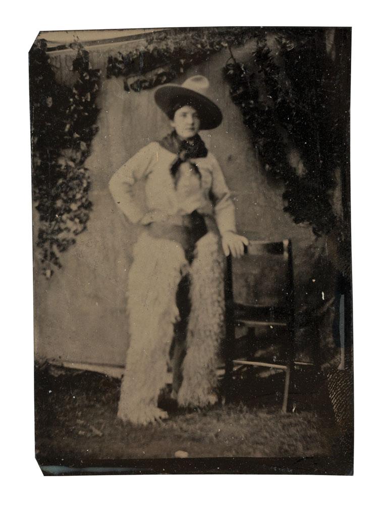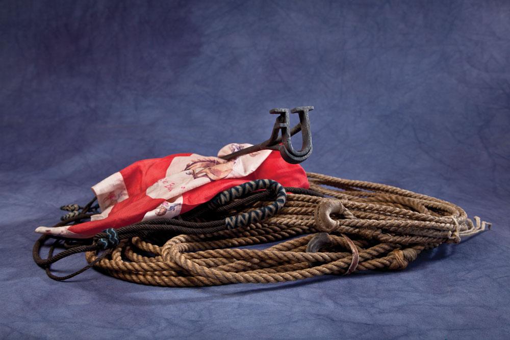 a) Tintype photo of Marion Cottle, Jordan’s wife, 3 1/2” x 2 1/2” Mrs. Cottle wearing her white wooly chaps, hat and silk scarf; b) Silk scarf, bucking horse in oval with The Round Up – let ‘er Buck, white border with series of bucking horses; c) Cottle’s Branding Iron, horse size; d) Rawhide reata, grass rope, and braided horsehair headstall.