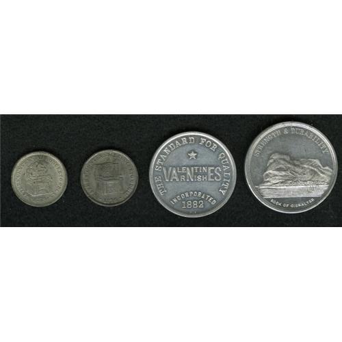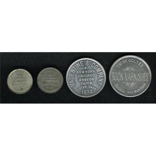 <B>Group Lot of Four Miscellaneous Merchants Tokens.</B></I> Included in this lot are tokens from the following: The De Golyer Rock Varnishes, Chi-49, Uncirculated; Valentine & Co., New York, NY-NY 350, Uncirculated; a pair of tokens issued by Horace Waters & Sons, New York, NY-NY 364 and 365, both AU/Unc. These tokens are listed in the <I>Standard Catalog of U.S. Tokens 1700-1900</B></I> by Russ Rulau. Viewing is recommended.