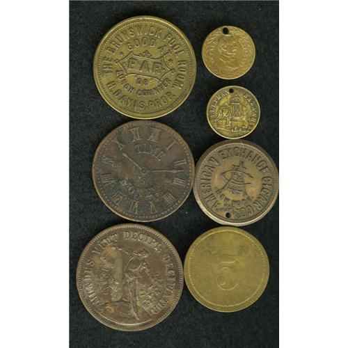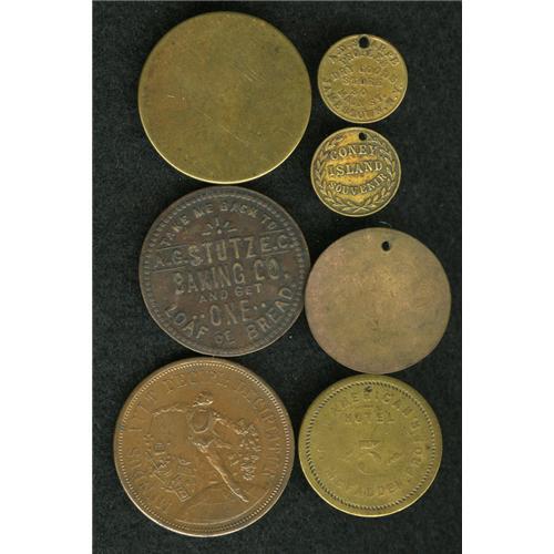 <B>Group Lot of Seven Miscellaneous Merchants Tokens.</B></I> Includes four Maverick tokens: American Hotel, American Exchange, Brunswick Pool Room, and Stutz Bakery; plus three listed tokens: Martinka & Co, New York, NY-NY-185; Coney Island, New York, HT-NY-Bkn 24 (this is the plate piece in Rulau), and A.D. Sharpe, Jamestown, N.Y., NY-Jm-9, political token for Grover Cleveland, circa 1884. Nice group lot. Viewing is recommended.