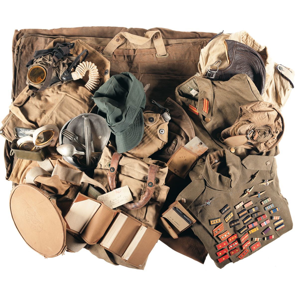3 flight helmets, 3 pairs of goggles, canteen with cover, WWI gas mask with bag, 2 belts, U.S. Army correspondence tablet, mess kit, signal mirror, green cap, USN canvas duffle bag, 2 military dress coats, field jacket, duffle bag, 2 garment bags, U.S. stationery , canvas organizer with pockets, 30 cloth insignia (mostly rank, appears to be Asian), 9 Soviet wings, 16 service ribbons.