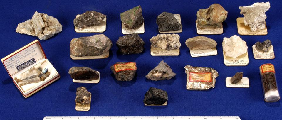 Miscellaneous lot of 21+ minerals specimens. Notable pieces include a 1/2 in piece of josephenite - a rare Ni-Fe alloy with the appearance of a meteorite - only found within its type locality of Josephenite, OR, and several mineral specimens from the Magnet Cove Igneous Complex, AR. These include several crystalline pieces of the titanium dioxide brookite as well as a beautiful example of green wavelite showing typical radial growth habit. Crystalline and granular uvarovite on chromite, 2 examples of fluorescent withereite from IL, beautiful euhedral celestite from OK, and examples of allanite, glauconite, and phologopite are also present. In addditon to these minerals, there is a range of manganese ore from multiple location within the US. These include pyrolusite from NV, alabandite from Patagonia, AZ, a vial of "bog manganese" from Bisbee, AZ, amd manganite and pyrolusite from Carter Co., TN. Of potential mention is a wonderful pseudomorph of manganite after calcite. This photo only represents a portion of the total lot. Not all of the pieces in this lot were photographed.
