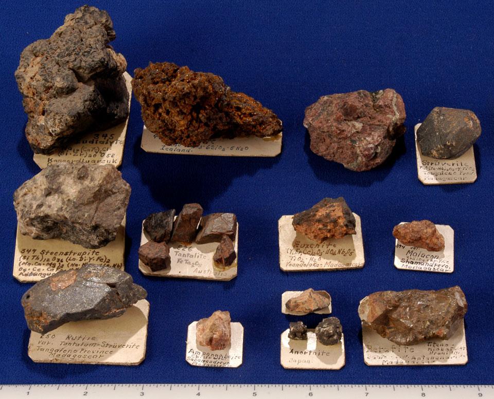 Lot of 13. Minerals include foxenite, eudialyte, heulandites, steenstrupite, anthite, ampangobeite, struverite, betatite, tantalite, malacon and others. Range in size from thumbnail to 3”x 4”.