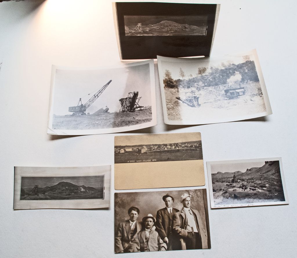 Lot of 6—5 photos and one negative of various mine scenes and one of a group of men, a post card by Grahame Hardy of Carson City, Nevada. The negative belongs to one of the photos, showing a head frame on left and mill site at far right. One is marked Hart Village, and two are marked Hamilton, California.