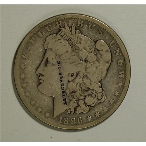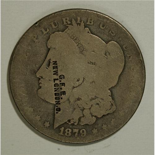 <B>Miscellaneous Morgan Dollar Counterstamp Lot.</B></I> Three counterstamped Morgan dollars: 1879-P counterstamped G.F.E. New London, O.; 1896-P counterstamped E.C. Beardsley; and an undated Morgan dollar counterstamped PATMAY2,71 & Dec28,75. This is a nice research lot that should draw the attention of counterstamp collectors. Market value $175-$275.<BR><BR><b>Shipping:</b> Coins & Currency (<a target="_blank" href="http://www.heritageauctions.com/common/shipping.php">view shipping information</a>)