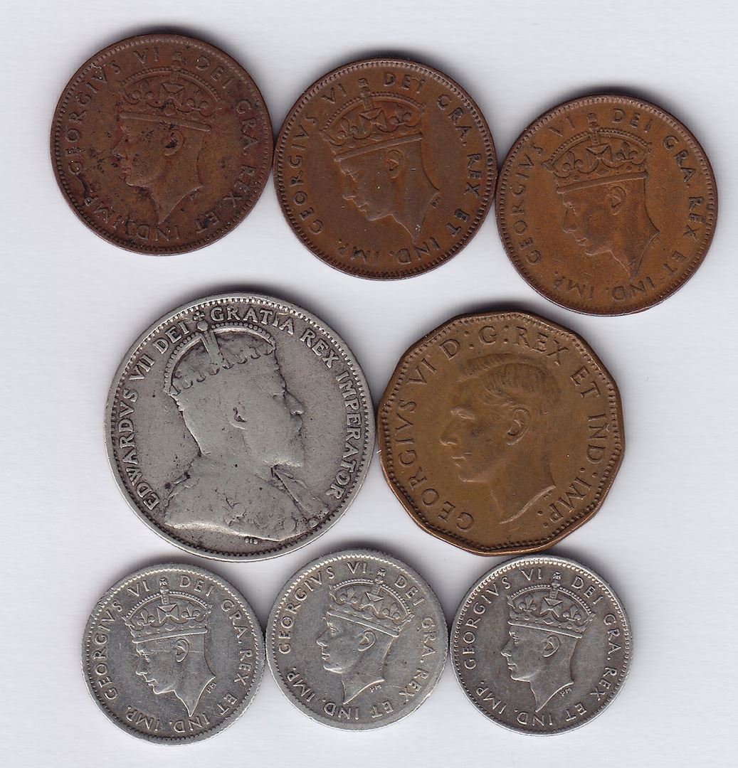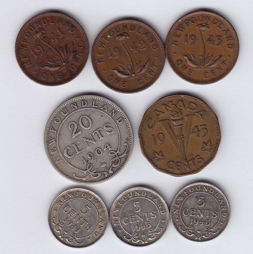 Miscellaneous Newfoundland Coin Lot Includes: 1941,42,43 small cents. 1941,43,45 five cent silvers, 1904 twenty cents. Bonus coin: 1943 Tombac Five cents. These are average conditions. Please view prior to bidding, no return. 8 Pcs.