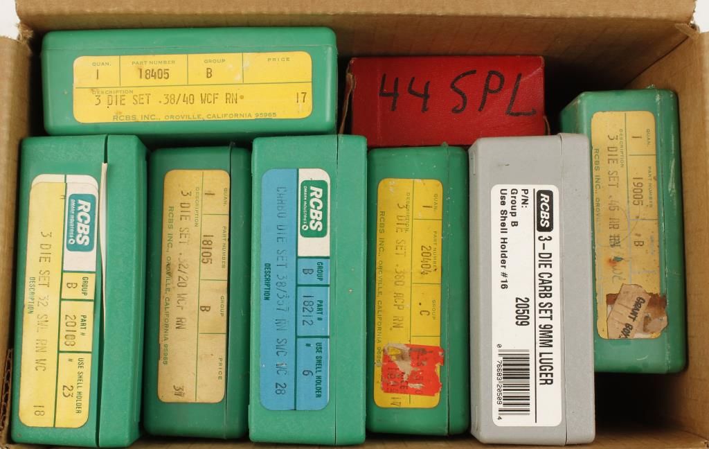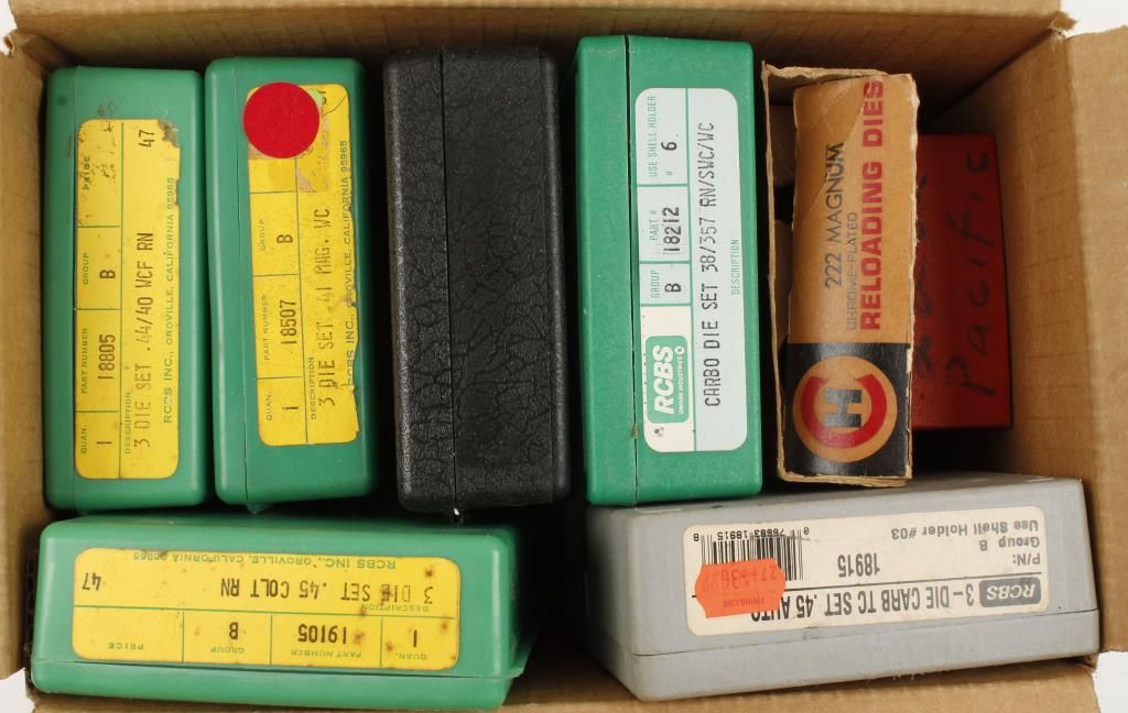 Dies include: .222 Rem, .222 mag, .38/357, .41L Colt, .41 mag, .44-40, .45 acp, .45 Colt, .32 S&W L, .32-20, .380 acp, 9mm Luger, .38-40, .44 spl, and .45 AR