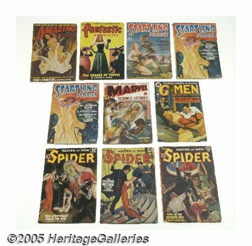 <B>Miscellaneous Pulps (Various, 1939-50) Condition: Average VG.</B></I> Here's a very nice group lot of classic pulp magazines: <B>Amazing Stories</B></I> V22#9 (1948, bondage cover); <B>Fantastic Adventures</B></I> V12#6 (1950); <B>G-Men Detective Stories</B></I> V18#1 (1940, bondage cover); <B>Marvel Science Stories</B></I> V1#4 (1939, classic "nude in a tube" cover); three issues of <B>The Spider</B></I> -- V15 #4 (1938), V18 #1 (1939), and V18#4 (1939); <B>Startling Stories</B></I> V20#1 (1949) and V22#1 (two copies, 1950). The Ultimate Guide to the Pulps VG approximate value for group = $500.