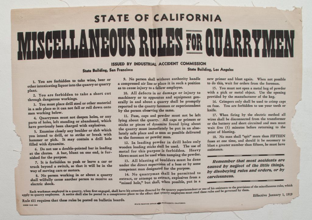 Broadside from the state of California. 12" x 18". Rule 1: No wine of beer in quarry, Rule 8: Do not willfully cause another person to receive a shock. Rule 18: No man shall "spit" - err, spit more than 15 fuses at one time. Rule 611 says that these rules must be posted. Several tears, but none that affect writing. One fold down he middle. Actual rules in awesome shape!City: County: State: CA