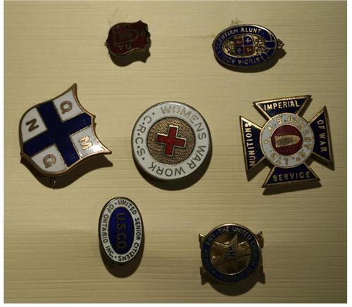 7 piece miscellaneous lot of service pins. Nice colorful enamelling with gold lettering, some small and medium size pieces with pin back or button style. Recognizeable examples; Women's War Work, United Church of Canada Life