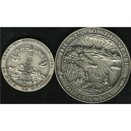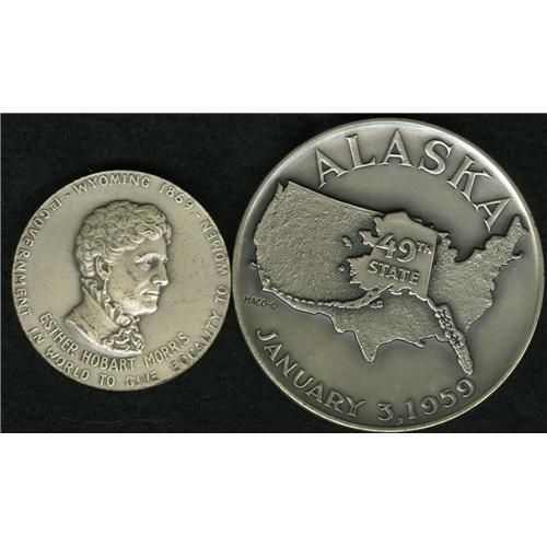 <B>Miscellaneous Silver Medal Group.</B></I> Includes a large silver medal measuring 63 mm, weighing 138.3 gm, struck by the Medallic Art Company of New York, issued to commemorate the statehood of Alaska, Jan. 3, 1959; and a second medallion from Medallic Art, commemorating the 75th anniversary of the state of Wyoming, 1890-1965, in .999 fine silver, measuring 44 mm and weighing 58.2 gm. The market value is approximately $125-$175.<BR><BR><b>Shipping:</b> Coin/Currency (<a target="_blank" href="http://www.heritageauctions.com/common/shipping.php">view shipping information</a>)